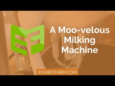 Orange graphic. Text reads, "A Moo-velous Milking Machine: An Exhibit about Milking Cows."