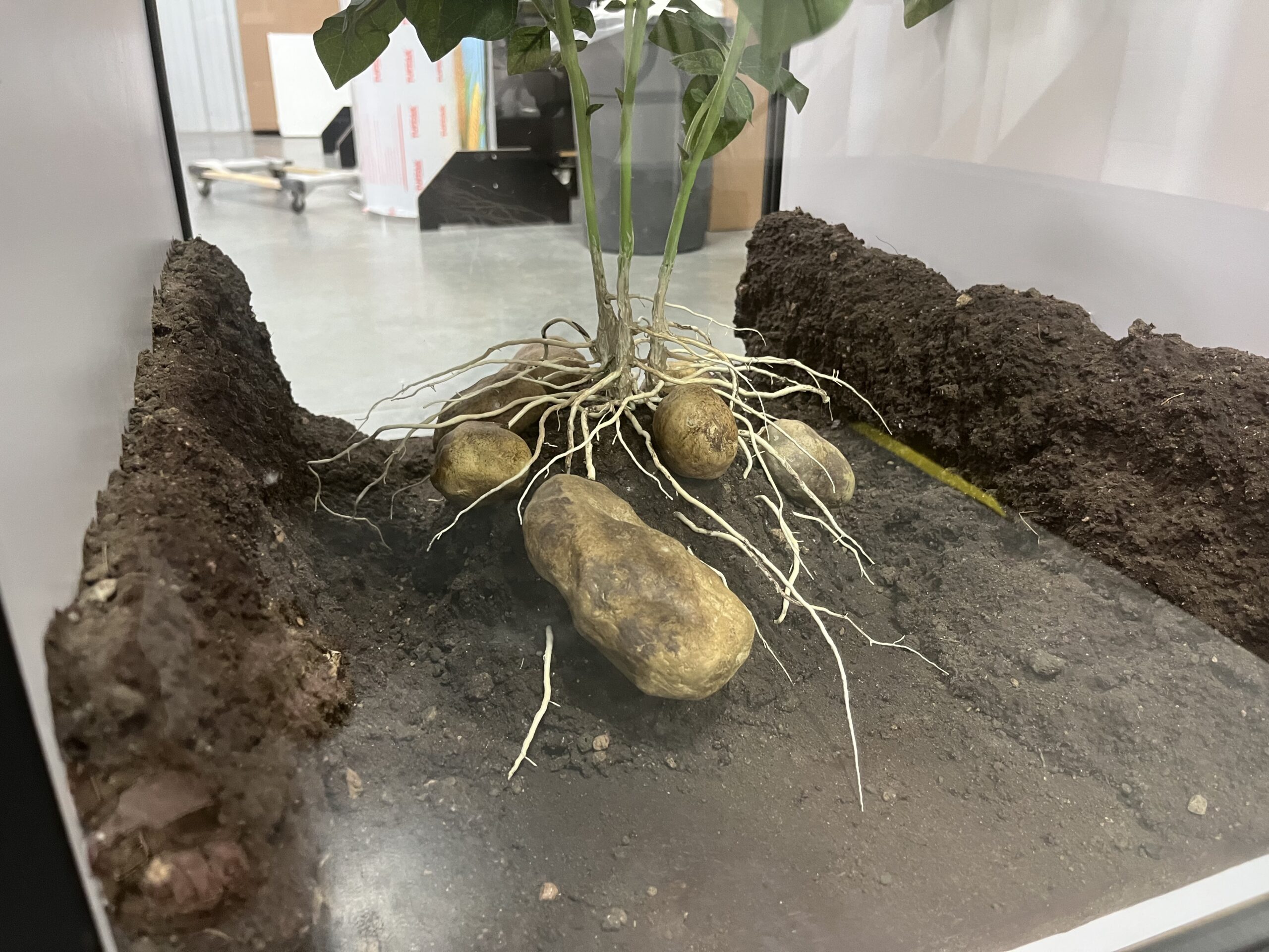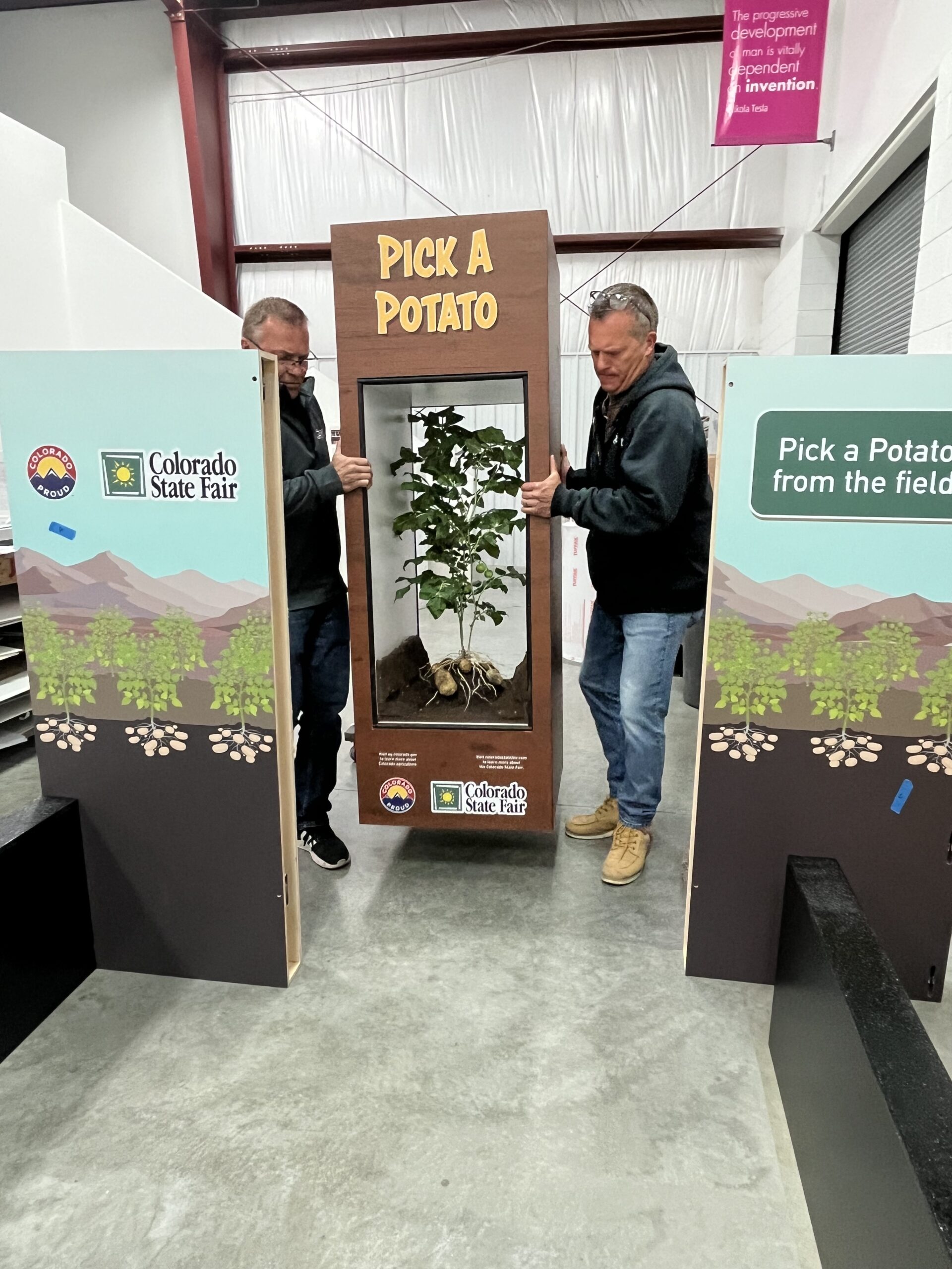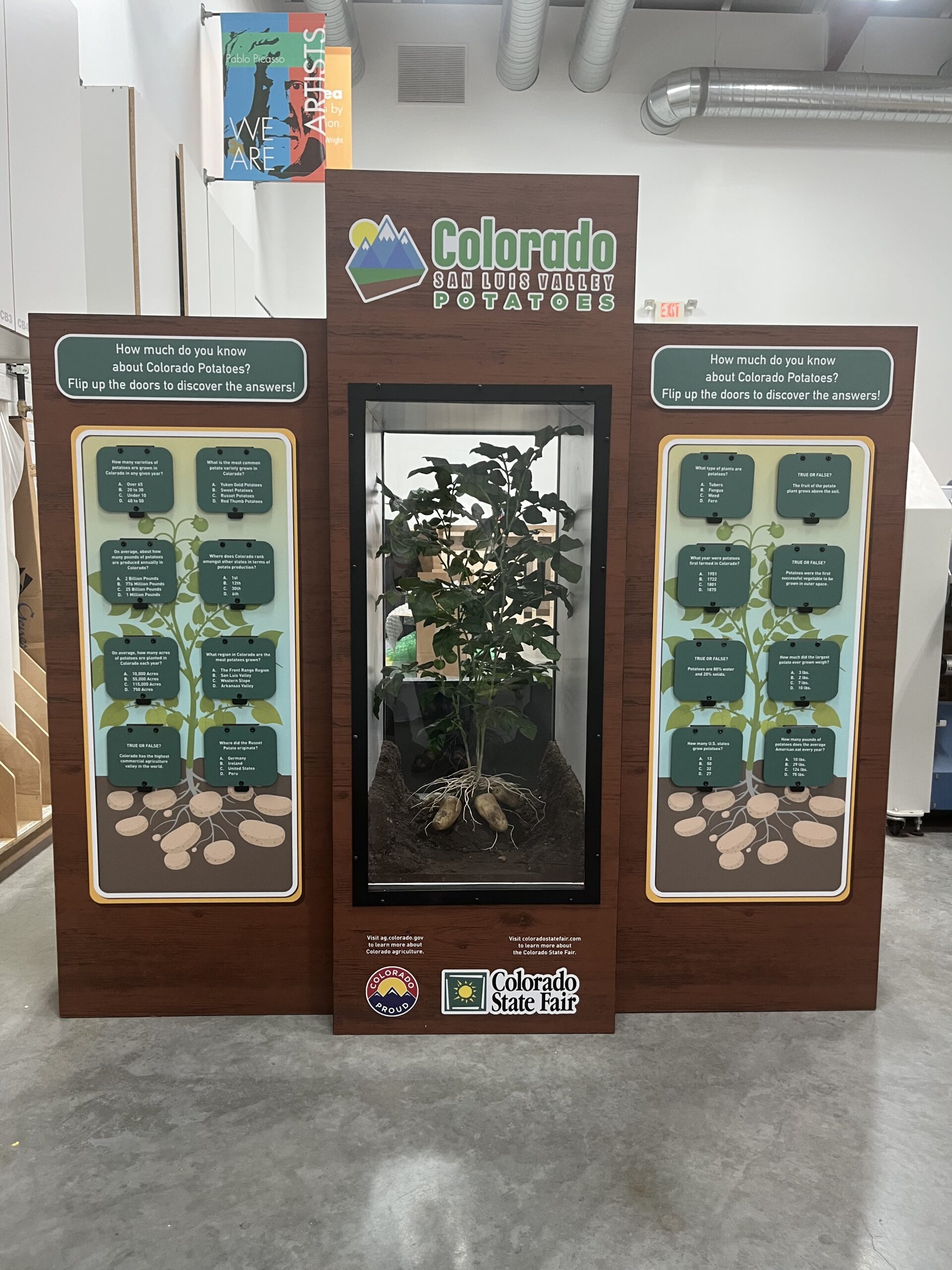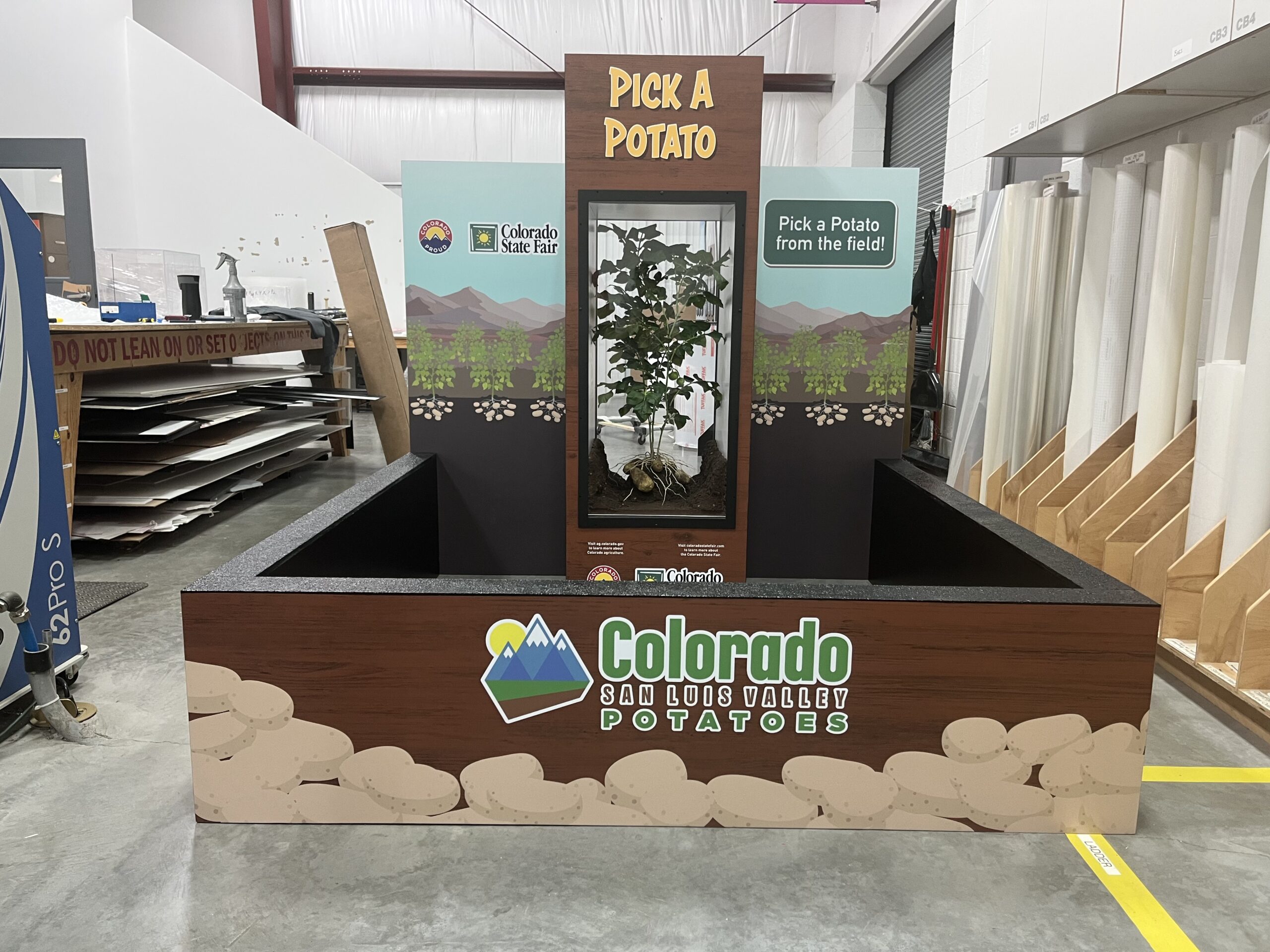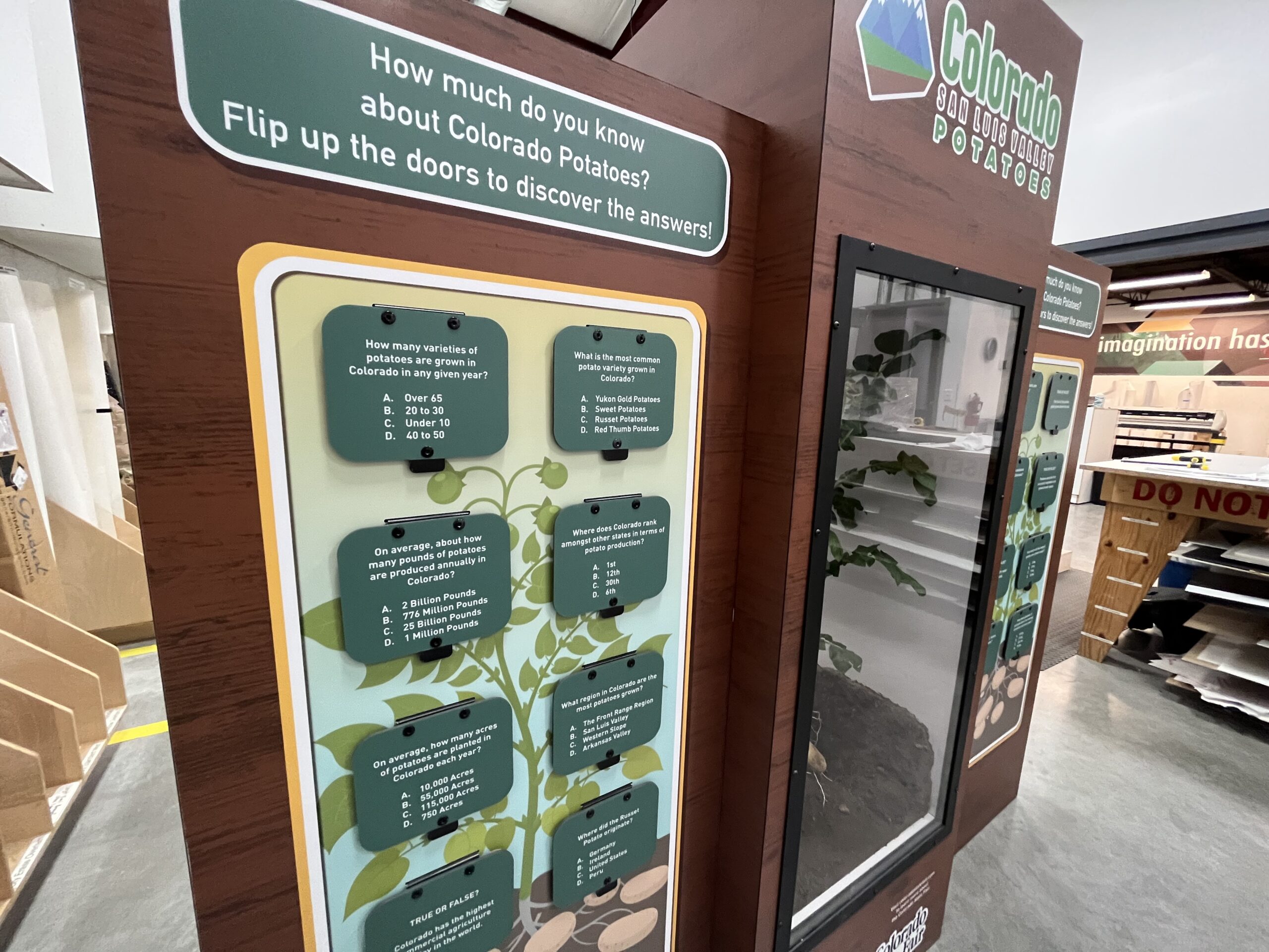 Colorado State Fair wanted an innovative and educational display that captivates their visitors. The front of the display has a “Pick A Potato” pit that the customer filled with soil and Colorado San Luis Valley Potatoes. The back of the display features 16 flip-up doors with trivia about Colorado potatoes. At the center of this display is a Russet Potato plant with a suspended exposed root structure. This display is easy to take down and put up with only one tool.
