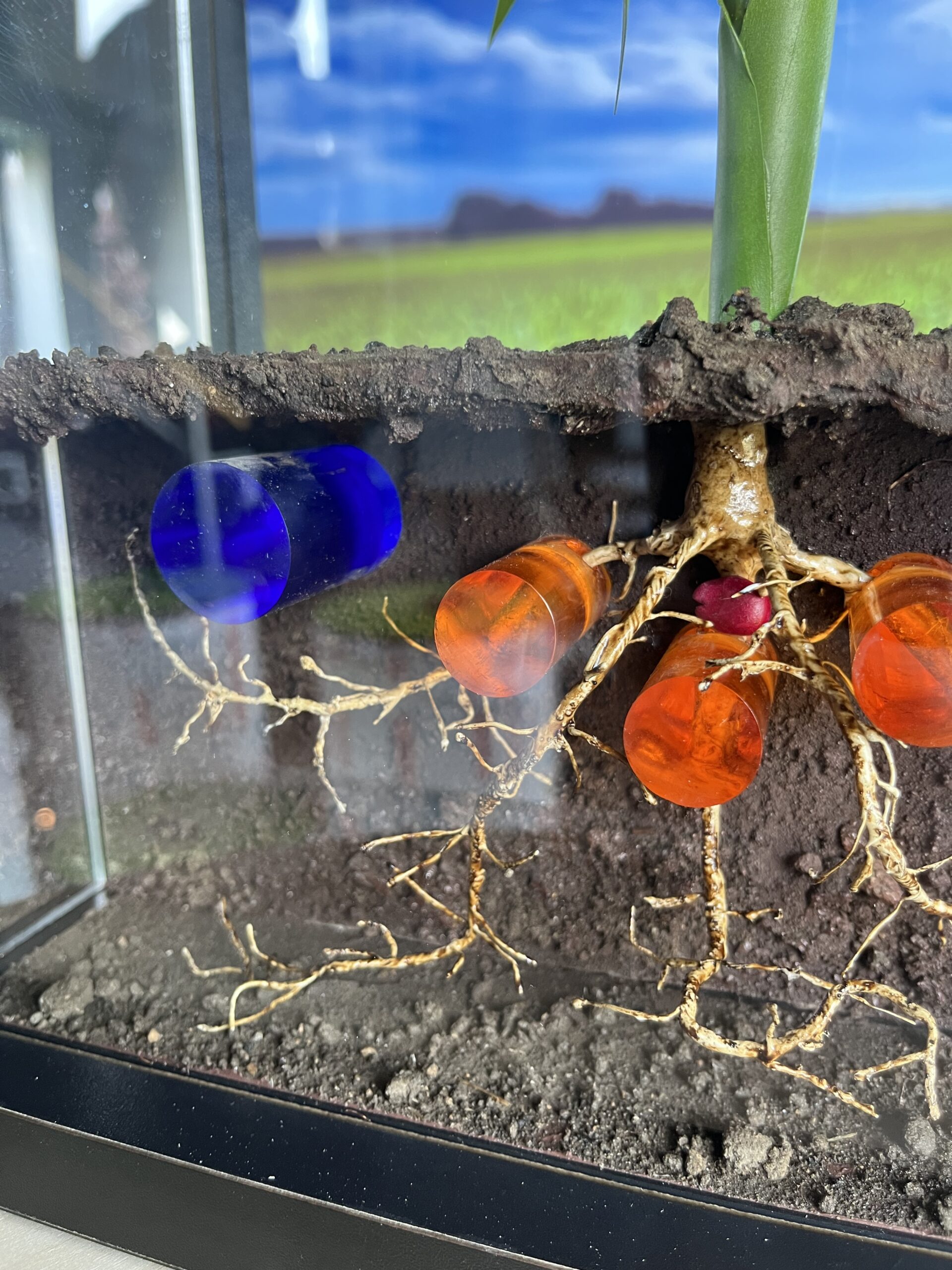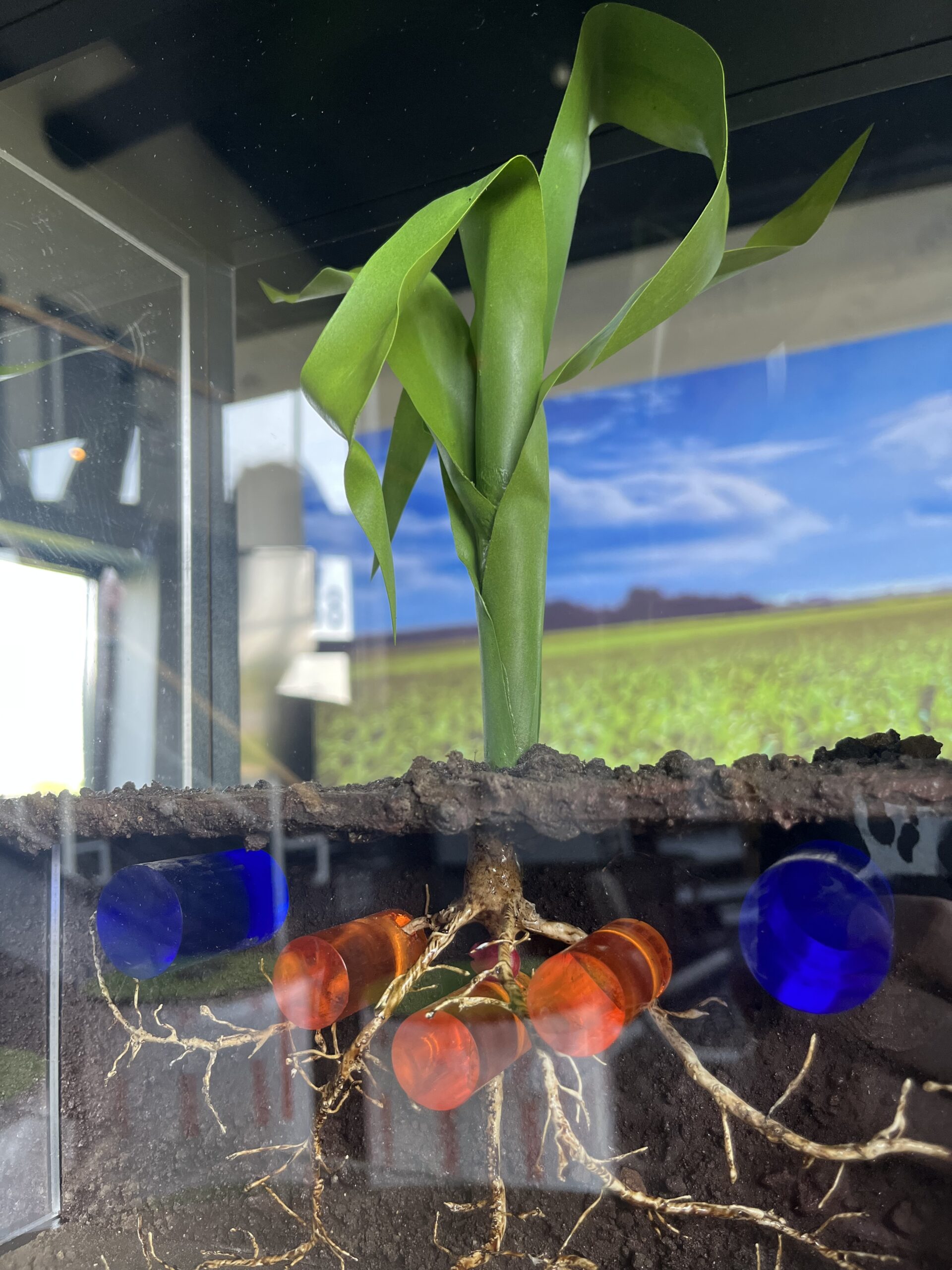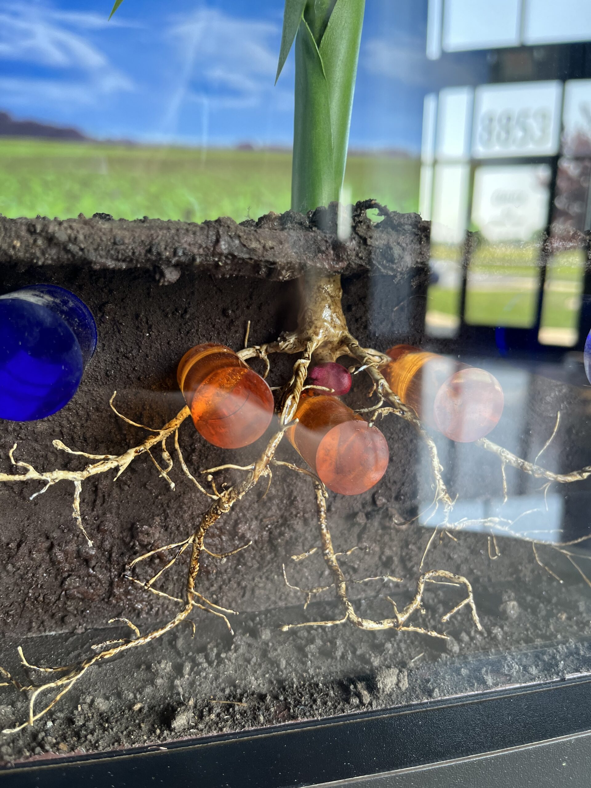 This fertilizer placement display, then, provides a visual illustration of the results. The cutaway view shows how the plant’s roots grow down through the fertilizer deposits, getting the most nutrients. The different-colored rods represent different kinds of fertilizer.